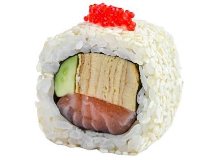 рол із крем-сиром, огірком, лососем, вугром, креветкою і тунцем