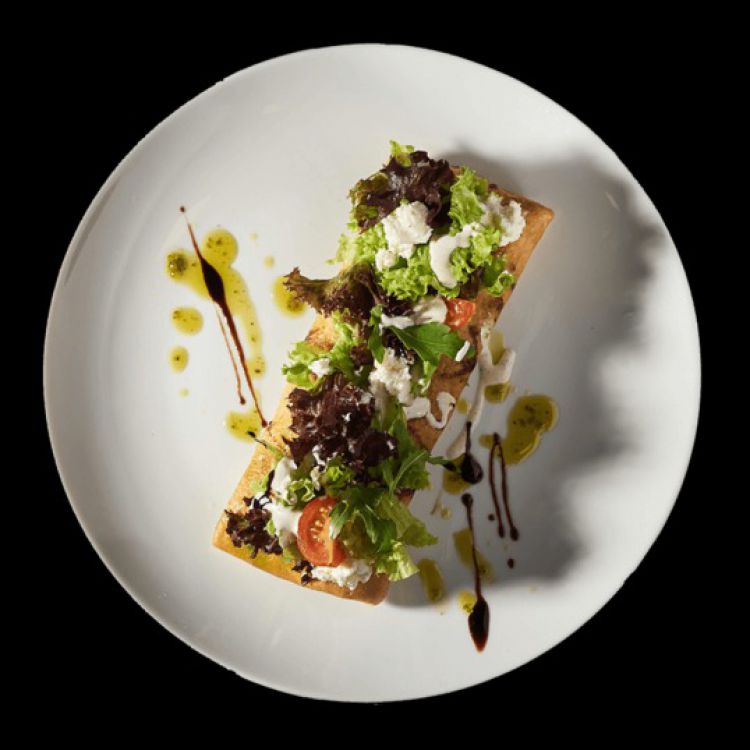 Крем-сир, огірки свіжі, сир фета, соус бальзамік, червона риба, мікс салату 185гСолоний млинець Туно