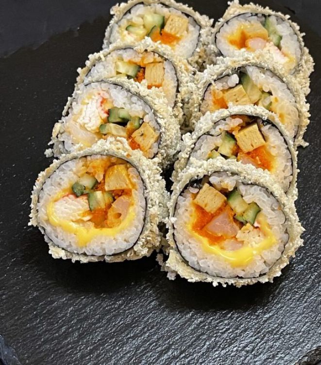 Детройт «Tatami-sushi»Рис, норі, плавлений сир чеддер, краб, тигрові креветки, ікра тобіко, огірок, мука темура, кляр, сухарі ПанкоВага 330гцена : 325 грн доставка по Измаилу: 120 грн