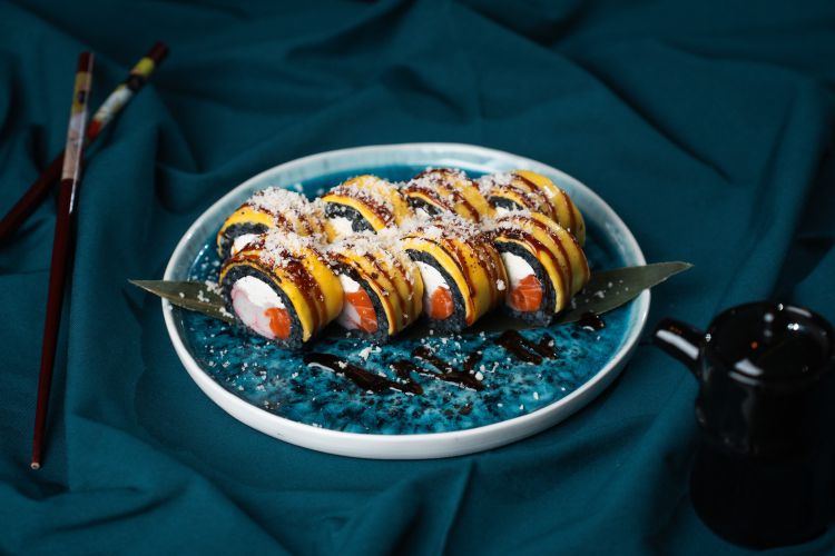 Рол N° 23 «Premium Sushi»чорний рис, сир філадельфія, мʼясо краба, лосось, соус унагі, сир тост, сир пармезан370g (8шт.)цена : 340 грн доставка по Измаилу: 120 грн
