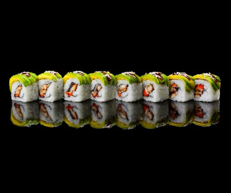 Зелений дракон «Tatami-sushi»Рис, огурец, угорь, икра Тобико,ссир Филадельфия, авокадо, унаги соус, кунжутВага - 260 р.цена : 285 грн доставка по Измаилу: 120 грн