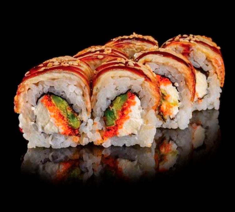 Золотий Дракон «Tatami-sushi»Рис, норі, сир Філадельфія, огірок, копчений лосось, ікра Тобіко, вугор, унагі соус, кунжутВага - 280 р.цена : 360 грн доставка по Измаилу: 120 грн