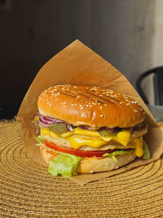 Бургер Яловичий «Lux_Cafe»Соковита яловича котлета, Сир Чеддер, Авторський соус, Салат Айсберг, Цибуля, Огірки та свіжі томати цена : 120 грн доставка по Измаилу: 120 грн