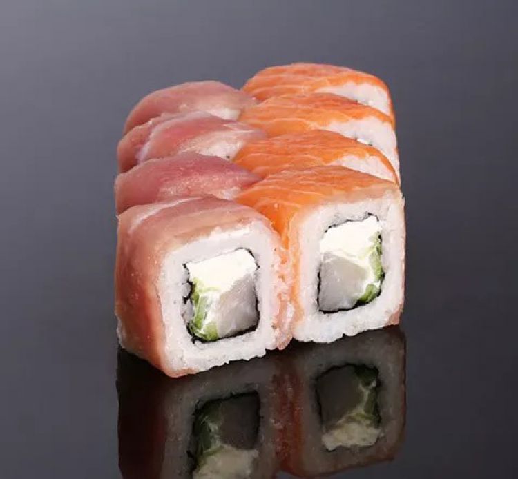 Веселка «Tatami-sushi»Рис, норі, японський омлет, сир Філадельфія, огірок, тунець, лососьВага - 260 р.цена : 280 грн доставка по Измаилу: 120 грн