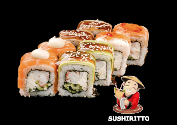 Веселка «SushiRitto»Свіжий лосось, копчений вугор, тигрова креветка, сніжний краб, вершковий сир, огірок, соус солодкий чилі, японський майонез, соус Унагі, кунжут260 гр.цена : 290 грн доставка по Измаилу: 120 грн